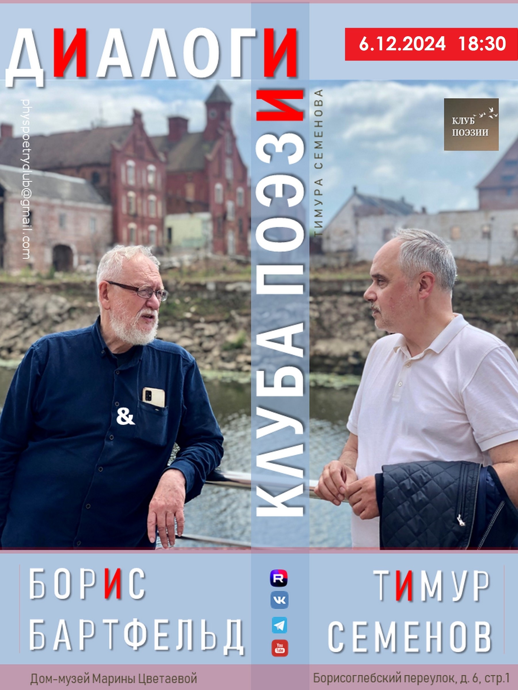 «…Я давно люблю стихи Бориса Бартфельда – прозрачные и мудрые, точные в деталях и мистические по своей сути, всегда неожиданные и добрые. В обсуждении и чтении стихов мы уделим внимание недавнему сборнику “Corpus solidum / Осязаемое тело” (М., 2022). Кстати, одним из первых ее отрецензировал друг Клуба поэзии и участник Диалогов поэт Геннадий Калашников, отметив, что “главные герои книги стихов Бориса Бартфельда – время и история”», – говорит председатель Клуба поэзии Тимур Семенов.