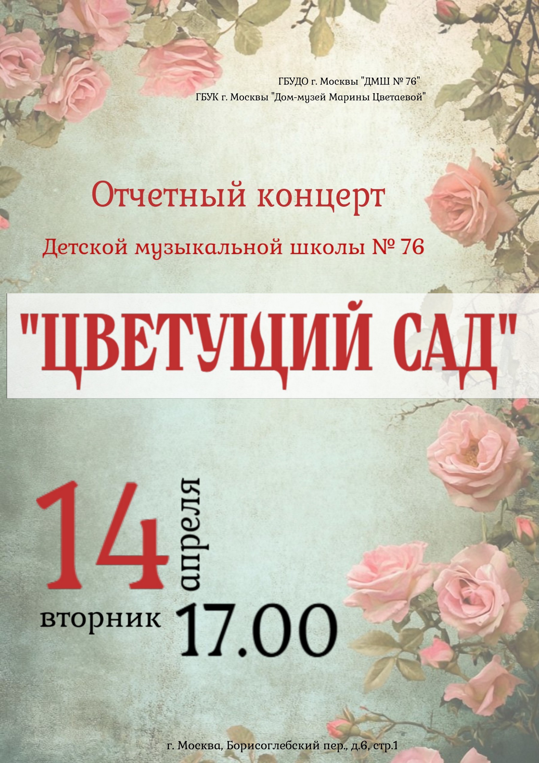 14 апреля (это вторник) в 17.00 Детская музыкальная школа № 76 проведет в Доме-музее Марины Цветаевой отчетный концерт «Цветущий сад». Юные музыканты – учащиеся школы – подарят слушателям живую энергию искусства и вдохновения.