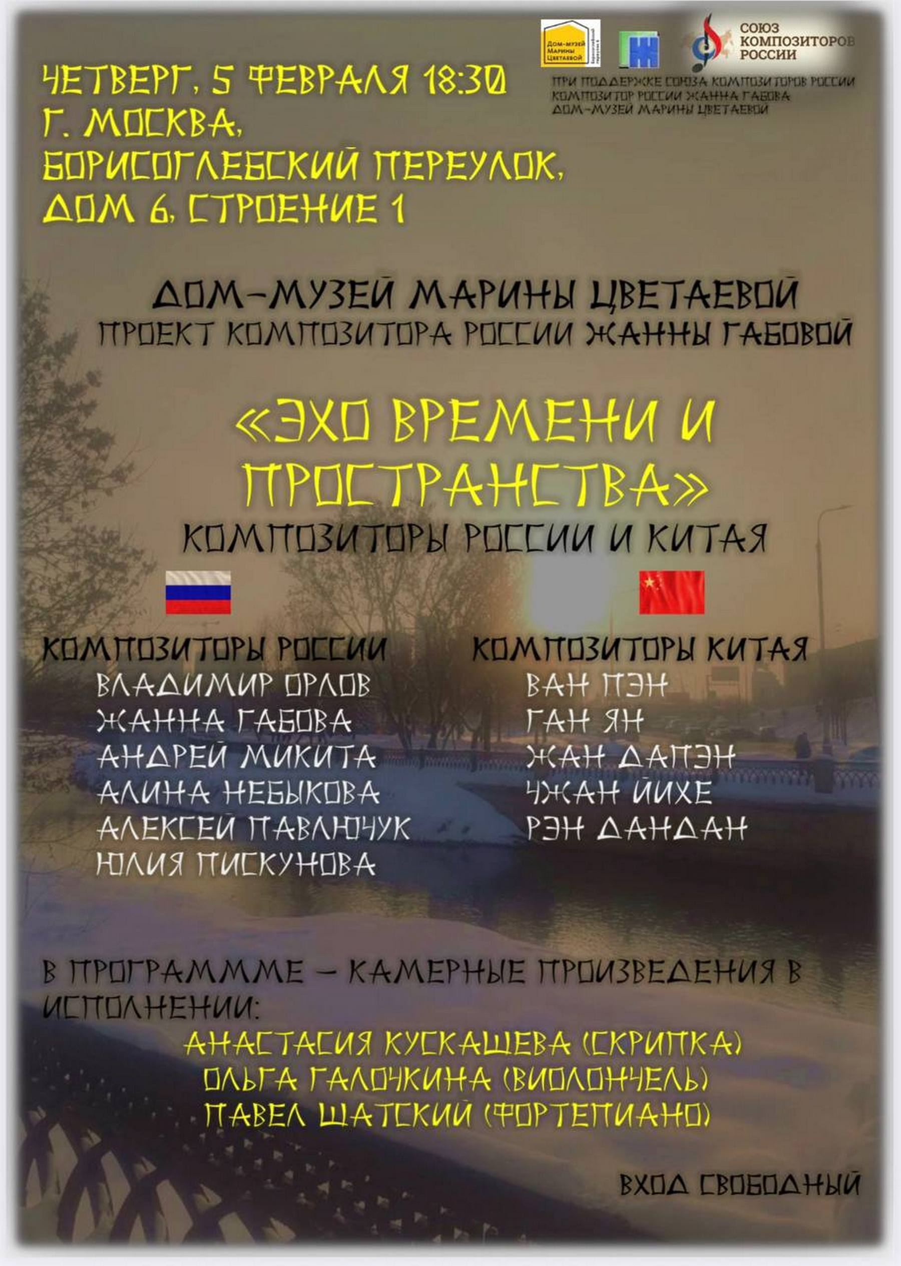 «Эхо времени и пространства» – Первый международный музыкальный проект композитора Жанны Габовой при поддержке Союза композиторов России – посвящен музыке современных российских и китайских композиторов, которые в рамках проекта знакомятся с творчеством друг друга и с игрой прекрасных музыкантов. В этом году запланированы два концерта проекта – в Москве и в Саратове. Московский концерт состоится 5 февраля в Доме-музее Марины Цветаевой: в исполнении Анастасии Кускашевой (скрипка), Ольги Галочкиной (виолончель) и Павла Шатского (фортепиано) прозвучит камерная инструментальная музыка.
