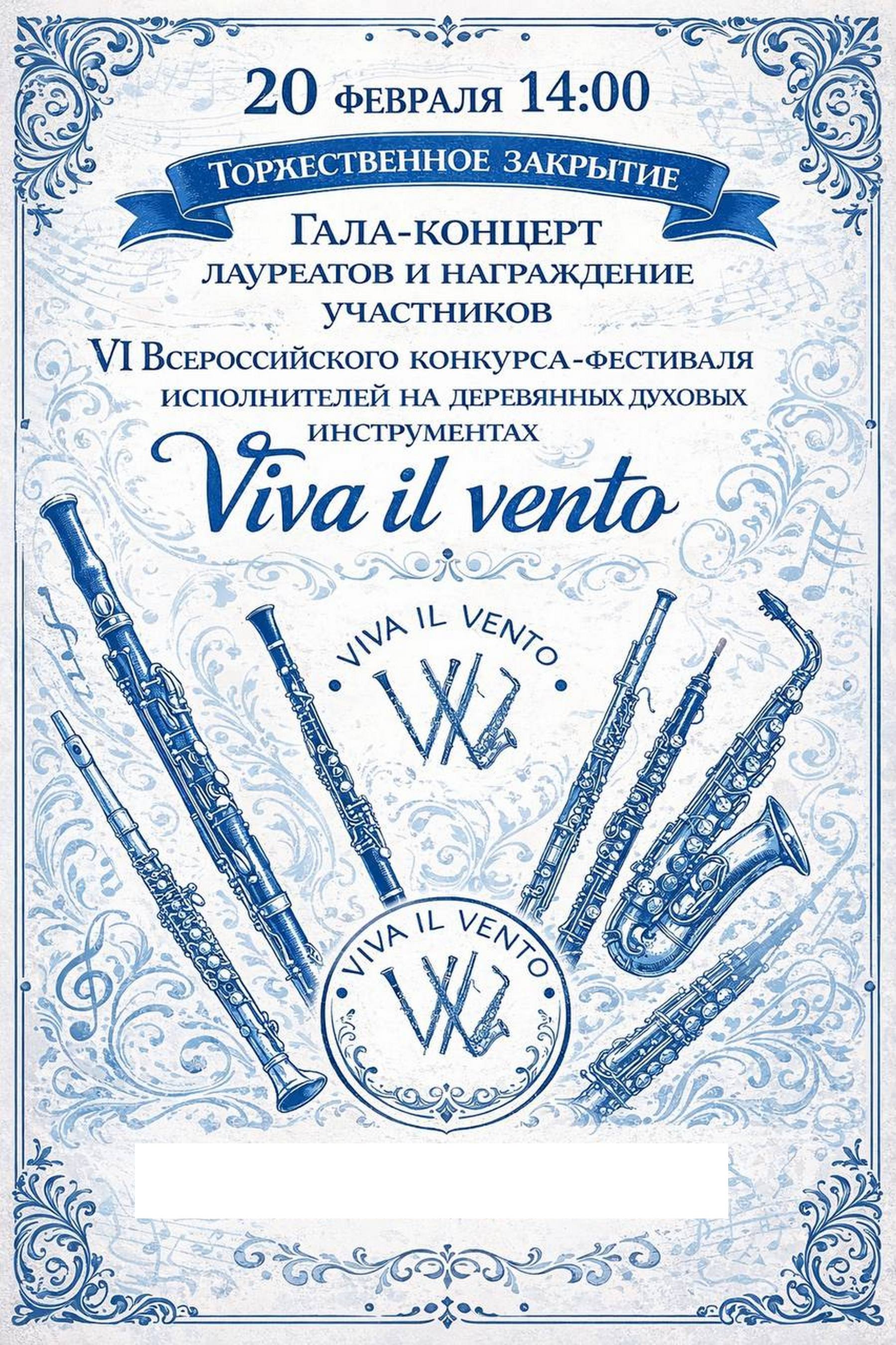 20 февраля (это пятница) в 14.00 в Доме-музее Марины Цветаевой состоится торжественное закрытие, гала-концерт лауреатов и награждение участников VI Всероссийского конкурса-фестиваля исполнителей на деревянных духовых инструментах «Viva il vento».