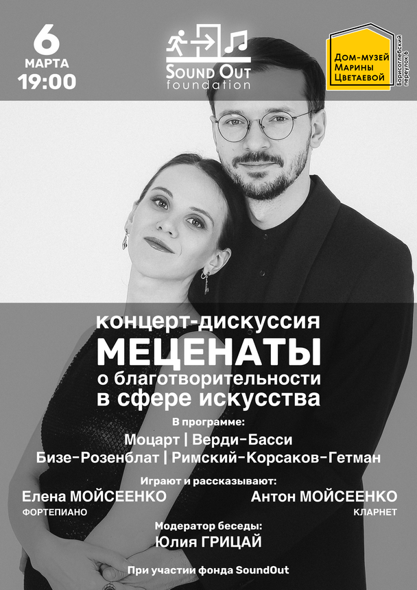 Перед вами выступят соучредители Фонда SoundOut: солист Кремлевского оркестра, БСО им. Чайковского, преподаватель КМТИ им. Вишневской Антон Мойсеенко и преподаватель ЦМШ-АИИ, лектор Елена Мойсеенко – с музыкальной программой для кларнета и фортепиано «Фантазии и танцы». Прозвучат произведения Моцарта, Верди – Басси, Бизе – Розенблата, Римского-Корсакова – Гетмана.
