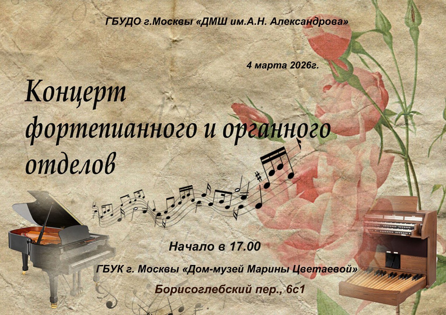 4 марта (это среда) в 17.00 в Доме-музее Марины Цветаевой состоится концерт учащихся фортепианного и органного отделов ДМШ им. А.Н. Александрова, посвященный Международному женскому дню.
