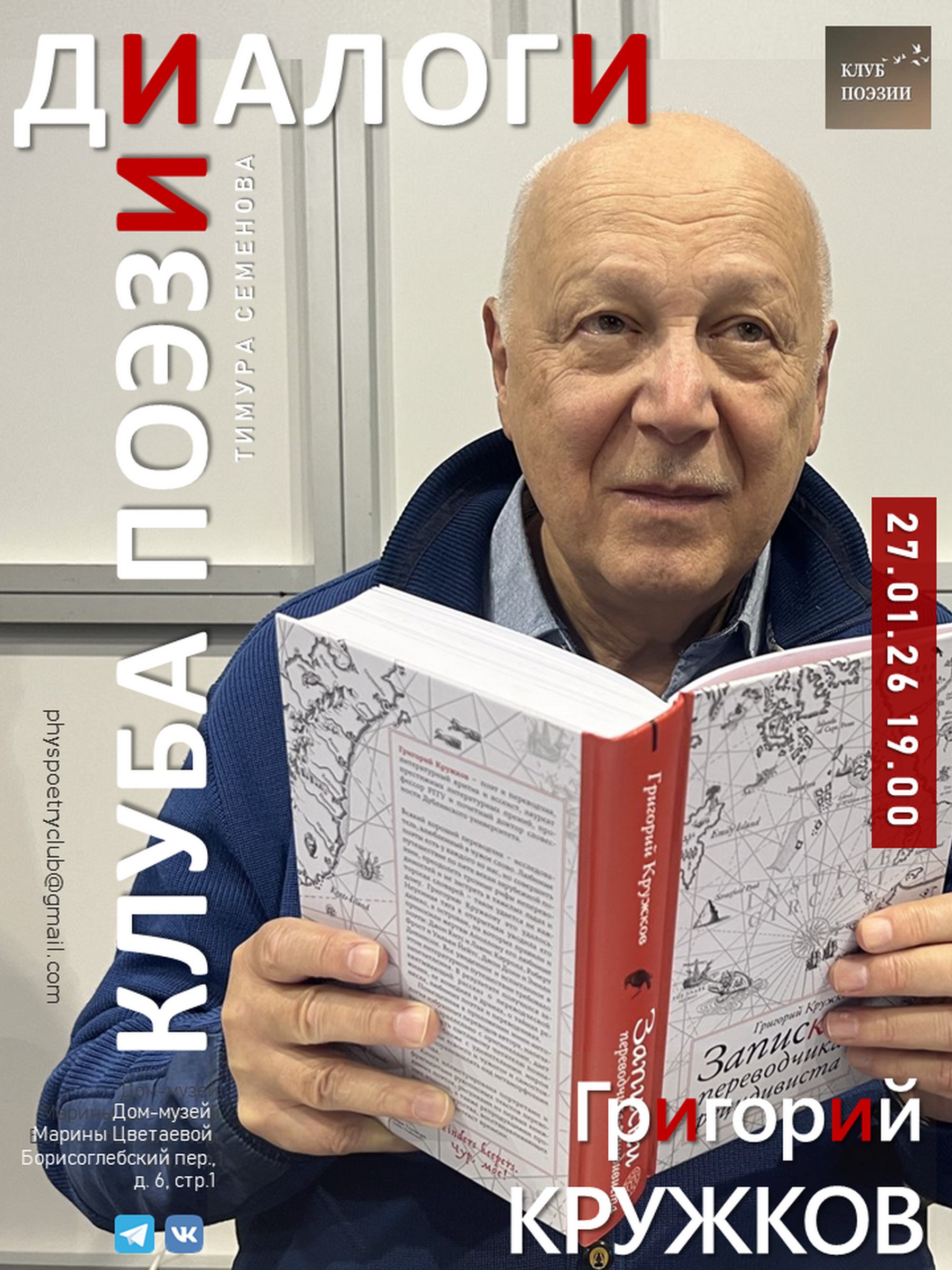 27 января (это вторник) в 19.00 в Доме-музее Марины Цветаевой пройдет очередной вечер «Диалогов Клуба поэзии». У нас в гостях – Григорий Кружков, поэт, переводчик, историк и исследователь литературы, теоретик перевода, эссеист.