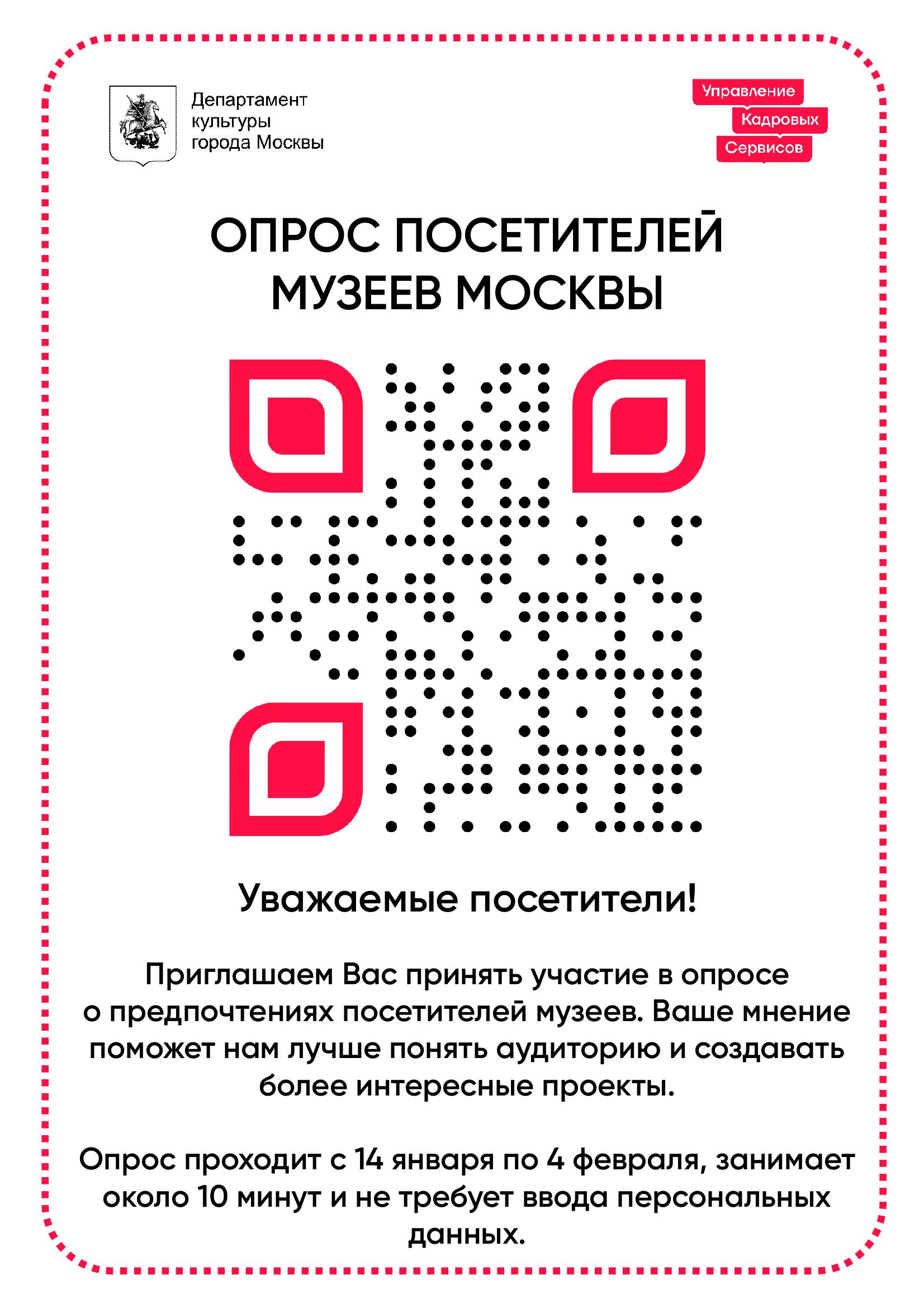 В целях изучения восприятия московских музеев различными группами населения, включая туристов из регионов России и зарубежных стран, с 14 января по 4 февраля 2026 г. Департаментом культуры города Москвы проводится социологическое исследование, направленное на выявление факторов, влияющих на посещаемость подведомственных учреждений, а также на определение потребностей и ожиданий туристической аудитории.
