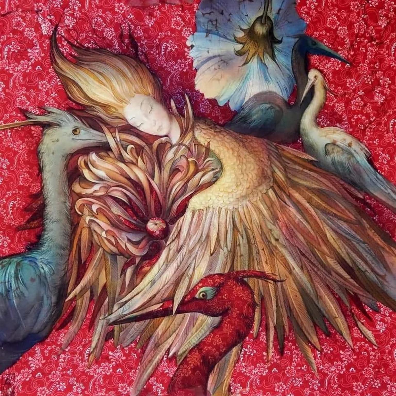 Техника работы с горячим батиком занимает особое место в искусстве Елены. Освоив один из самых древних и сложных методов ручной росписи, художница выходит за пределы понимания этой традиции. Экспериментируя с материалами, она создает авторскую технологию, сочетающую элементы батика, вытравки и графики на ткани. Важно подчеркнуть новаторский аспект, когда работа ведется не только по традиционной белой ткани, но и по цветным, принтованным основам. Это позволяет вступать в диалог с уже существующим орнаментом, превращая его в часть художественной композиции. Таким образом, произведение становится синтетическим: ткань несет в себе “память фабричного принта”, а поверх него возникает индивидуальный образ, созданный художником.