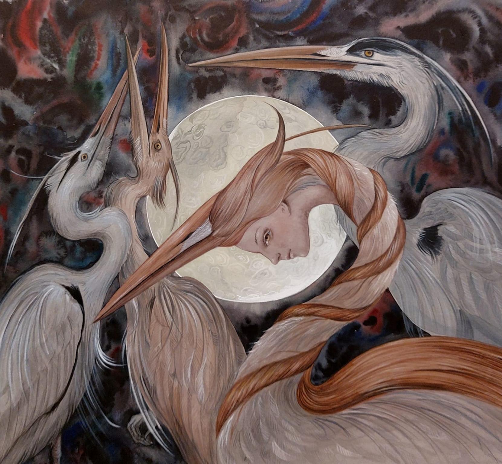 Немаловажен и аспект оформления. Художница применяет старинные рамы от зеркал конца XIX – начала XX века, чтобы ввести свои работы в поле культурных ассоциаций. Она подчеркивает связь с историческим опытом прошлого, наделяет образ глубиной и создает эффект “пространственного коридора” в сказочный мир. Здесь актуализируется тема времени − ткань и авторская техника несут современный импульс, а обрамление произведения отсылает к ушедшей эпохе.